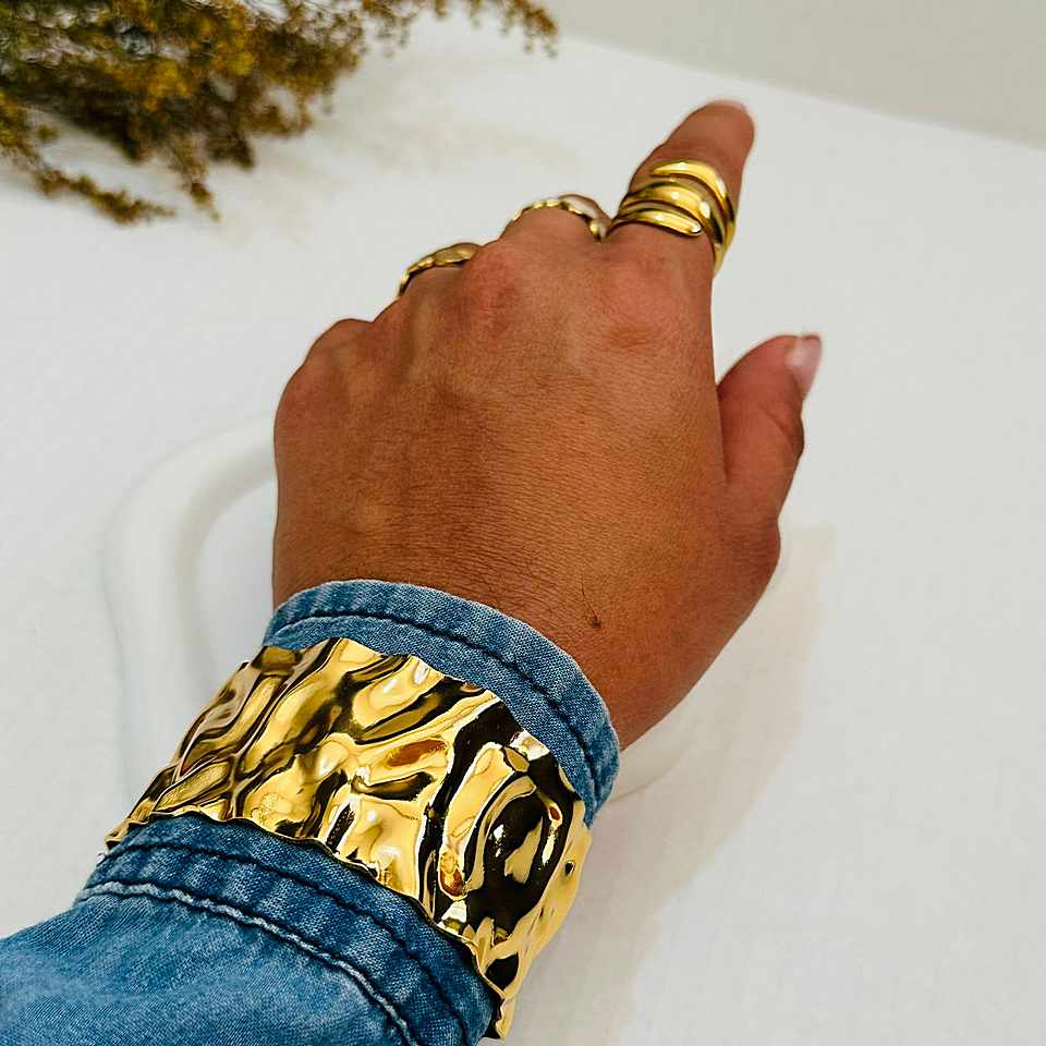 Este encantador brazalete en noble acero inoxidable es mucho más que un accesorio: es una extensión de tu personalidad, un detalle que marca la diferencia, con color oro que te hace ver la más poderosa del lugar.
