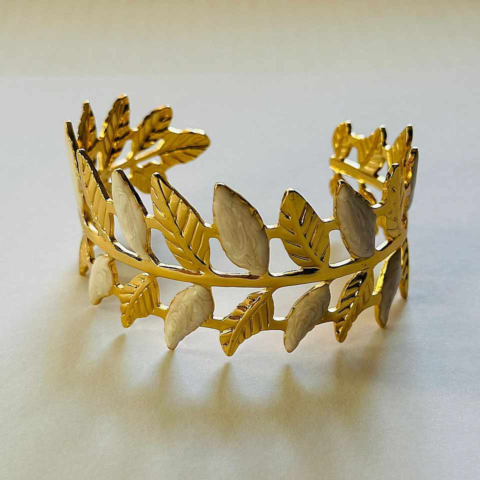 Hermoso y delicado brazalete trabajado en acero inoxidable con detalles únicos, forma de hojas